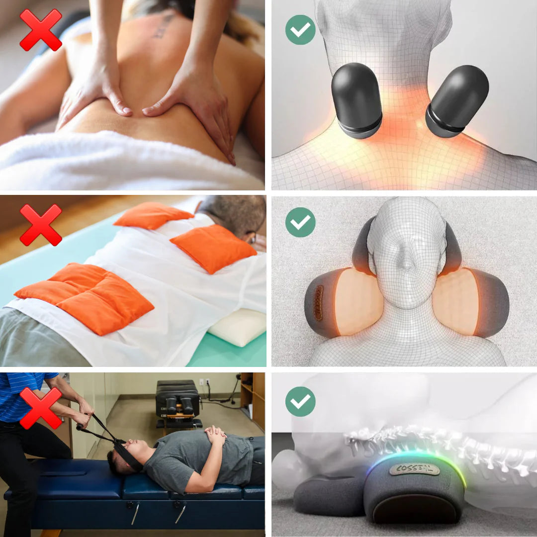 Notre dispositif combine massage thérapeutique, thermothérapie par la chaleur et traction cervicale dans un seul appareil facile à utiliser chez soi.
